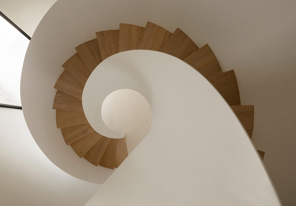 A sculptural spiral scale welcomes us when we enter the house in a distributor volume. It is followed by the open island kitchen that takes an important role. The living room occupies a high volume, open at the corners with a fireplace. The main room faces a more intimate and private garden.